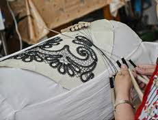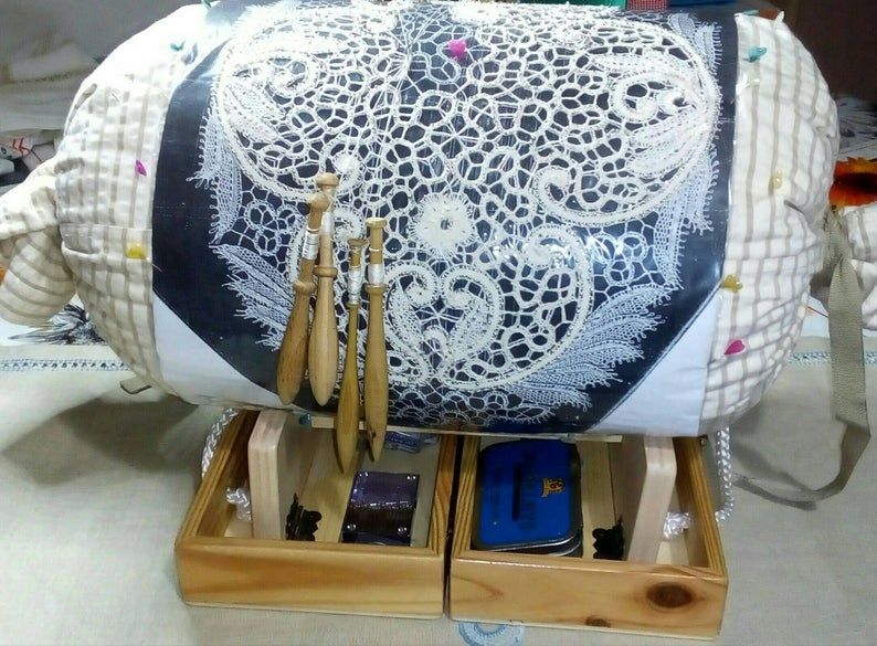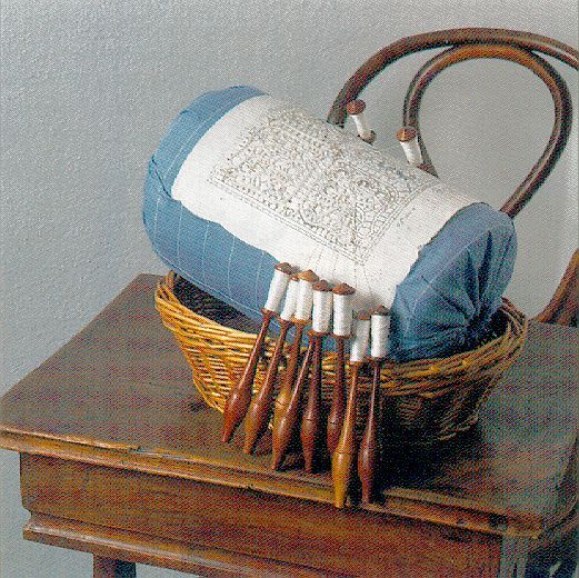 Como ya he dicho, no solo se hacen encajes de cinta con ellas, también se utilizan para trabajar encajes lineales. Si bien presentan la enorme ventaja de que no hay que subir la labor, algunas técnicas y diseños requieren muchísimos bolillos, por lo que trabajarlos en este modelo de almohada, para mi, resulta complicadísimo y un misterio que me hace admirar profundamente a estas encajeras. Veamos algunos ejemplos.