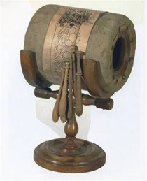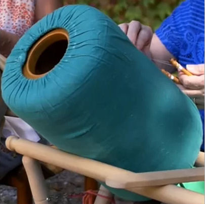 Las almohadas cilíndricas o de rulo, se diferencian de los mundillos o almohadas planas por su forma tubular. Aunque tienen poca variación en su configuración, no ocurre lo mismo con el tamaño y podemos encontrarlas grandes, grandísimas y pequeñas. Pueden estar rellenas de paja, de serrín, de estopa… o actualmente de poliespán y se sujetan en un soporte de sobremesa o de suelo , que puede ser una cesta, una caja de madera, un cubo, un trípode de madera o una mesita especial…, cualquier cosa que permita que el cojín permanezca sujeto y al mismo tiempo se pueda girar para trabajar en distintas direcciones manteniendo siempre los bolillos en la posición adecuada para que los hilos que conforman la trama, estén perfectamente “peinados” y no queden claros o agujeros… y para que la encajera pueda mantener una posición correcta en todo momento con la espalda bien recta.