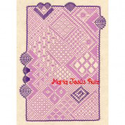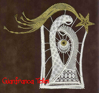 Punto de tul. Rellenos a medio punto. Fondo de rosa (fondo de filigrana) con punto de filigrana. Pies. Reseguido o hilo grueso. Inicio y remate.