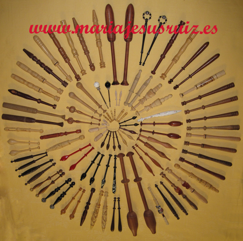 En estos momentos podemos encontrar bolillos que siguen siendo prácticamente iguales a los de antaño, que conservan en general el nombre geográfico de origen, o también el del tipo de encaje para el que se utilizan, y que siguen siendo perfectos para trabajar, podéis ver ejemplos en la entrada «Mis primeros bolillos». Pero también podemos encontrarlos del mismo tipo, actualizados con algunas variaciones en la forma de la cabeza, por ejemplo, o en el tamaño, o con preciosos y artísticos tallados en el cuerpo, o pintados o simplemente en maderas variadas y exóticas que no son propias de la zona… características todas que los convierten en objeto de deseo, sin dejar de resultar prácticos para hacer encaje. Y por último y gracias a la fantasía y creatividad de los artesanos que los hacen podemos encontrar modelos y formas tremendamente atractivas y artísticas y en distintos materiales, pero útiles solamente como objetos de colección… codiciados objetos de colección. La variedad, en cualquier caso, es casi infinita y el intento de clasificación u ordenamiento, prácticamente imposible… pero veamos algunos ejemplos, empezando por los españoles.